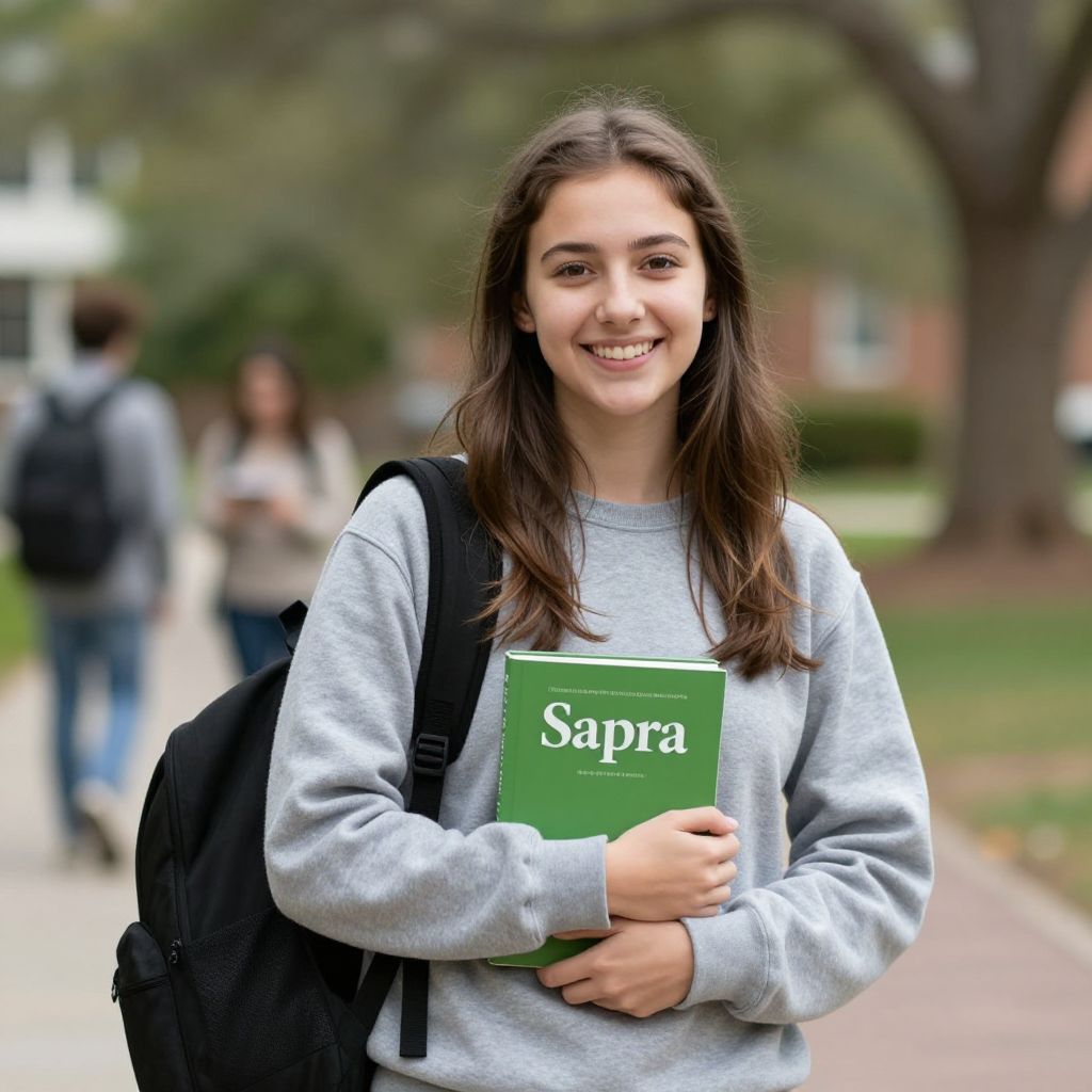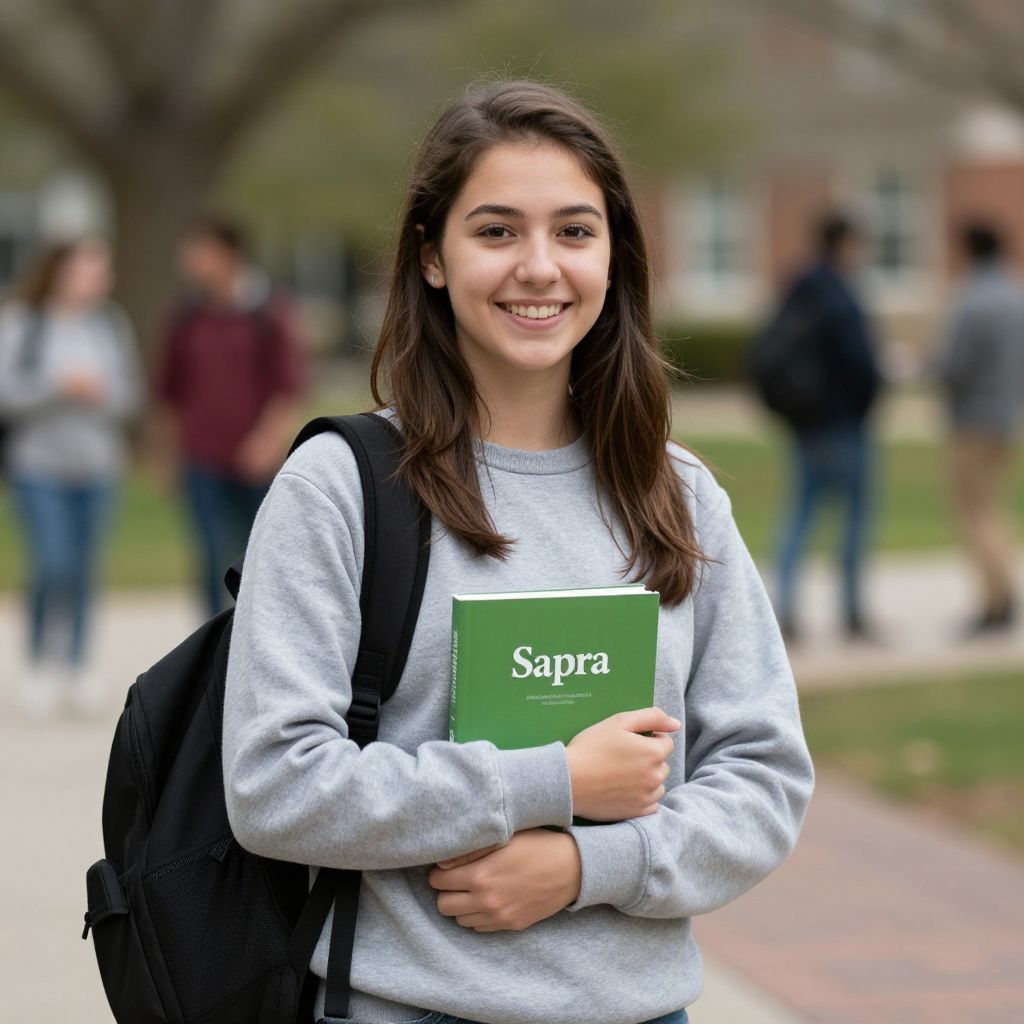 Smiling young woman in a gray sweatshirt stands outdoors on a college campus, holding a green book labeled \"Sapra\" while carrying a black backpack over her shoulder, with blurred figures and trees in the background.