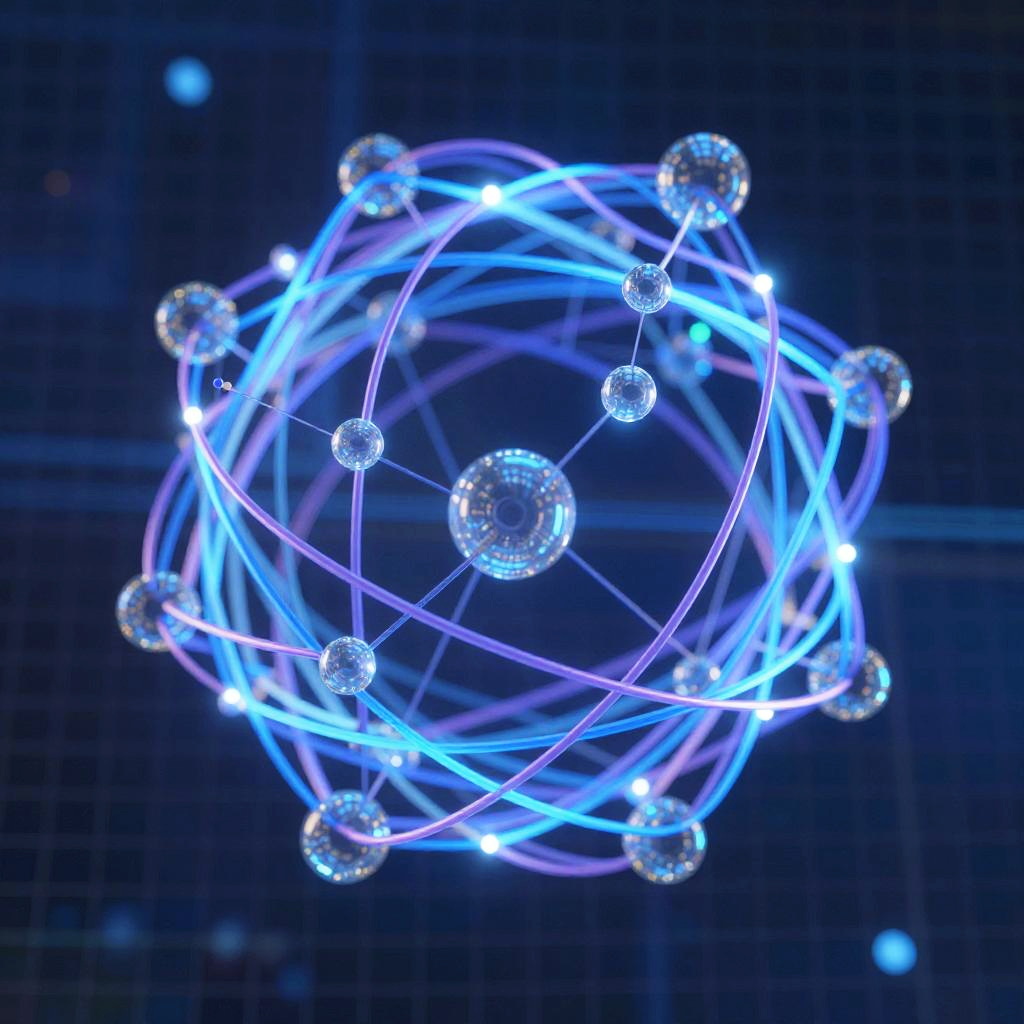 DenseNet inspired scene featuring a dynamic 3D lattice of bright electric blue and purple strands interlinking numerous translucent spheres, suspended in a digital matrix environment, highlighting the theme of efficient information flow in neural networks.
