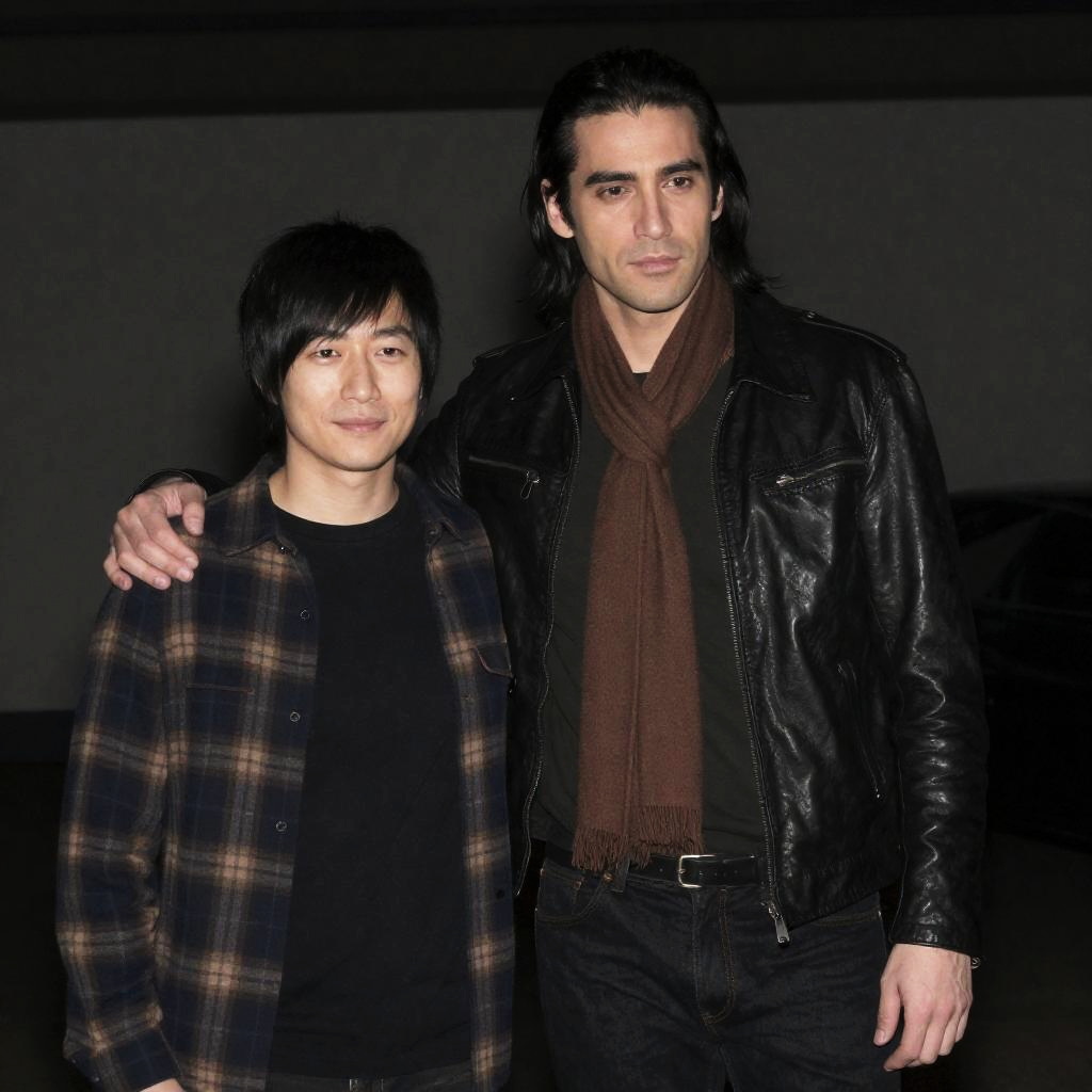 Photograph of two men standing side by side in a dimly lit indoor setting. The taller man with long dark hair is wearing a black leather jacket, brown scarf, and jeans, with his left hand resting on the shoulder of the shorter man. The shorter man has black hair and is dressed in a black shirt under a dark plaid jacket. Both men are looking forward, with the shorter man having a slight smile.