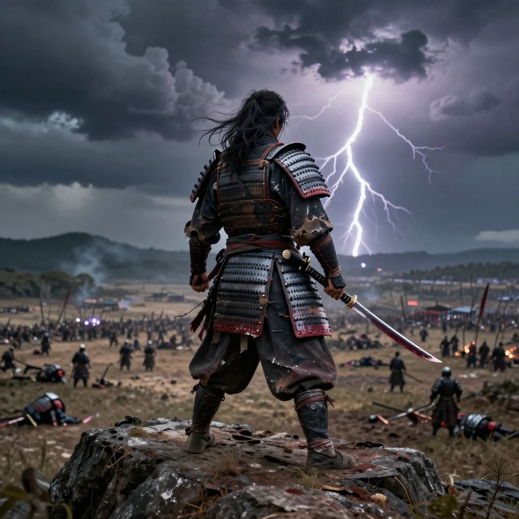 Photorealistic digital artwork of a samurai standing on a rock, back to the viewer, with a lightning bolt illuminating the stormy sky. He wears traditional armor with red accents, holding a sword in his right hand. The battlefield below is chaotic, with fallen soldiers and scattered bodies. The landscape includes grassy fields and distant mountains under dark, cloudy skies. The samurai's long hair flows in the wind, adding a sense of motion. The overall color palette is dark and dramatic, with contrasting bright lightning.