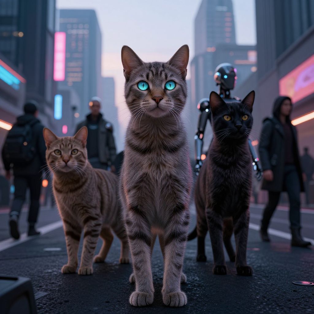 Photorealistic CGI image of three cats in a neon-lit, futuristic city street at dusk. The central cat, with glowing blue eyes and a gray tabby coat, stands front and center, looking directly at the camera. Flanking it are two other cats; one with a brown tabby coat to the left and a black cat with yellow eyes to the right. Behind them, a humanoid robot with a metallic body and glowing eyes walks. The background features blurred pedestrians, bright neon signs, and towering buildings, creating a cyberpunk atmosphere. The street is dark with scattered light reflections.