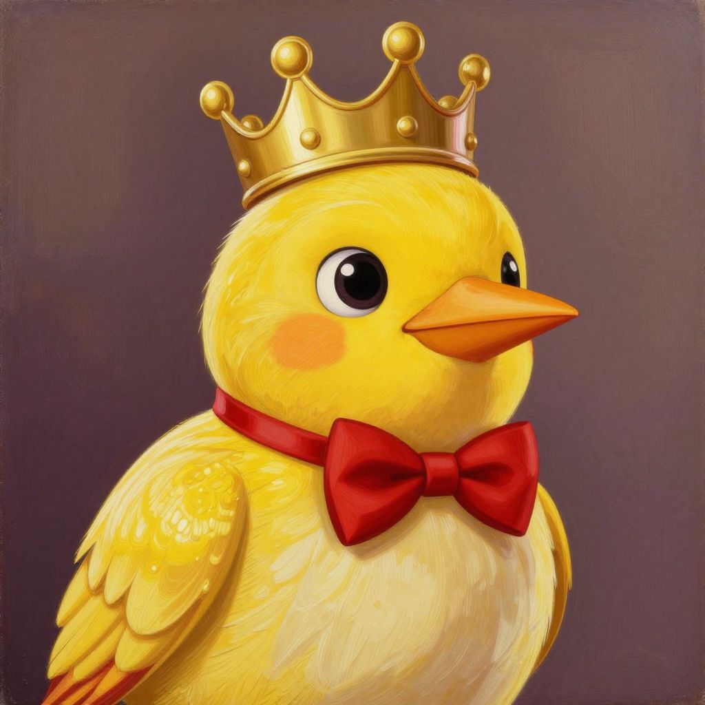 Digital illustration of a cute, yellow chick with large black eyes, wearing a gold crown and red bowtie, against a dark purple background.