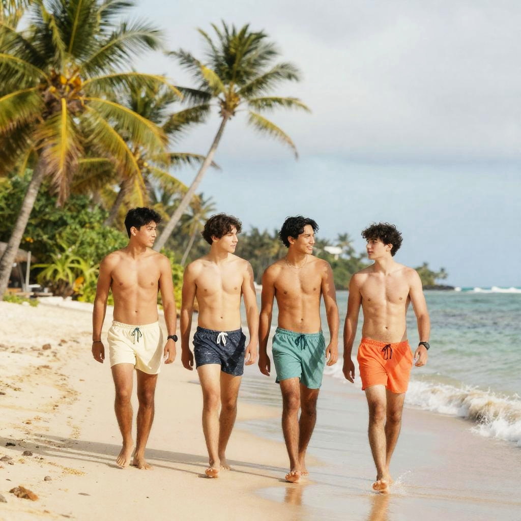 Boys wearing bikinis under colorful beach umbrellas, lively group scene, sunny day, detailed textures, relaxed mood
