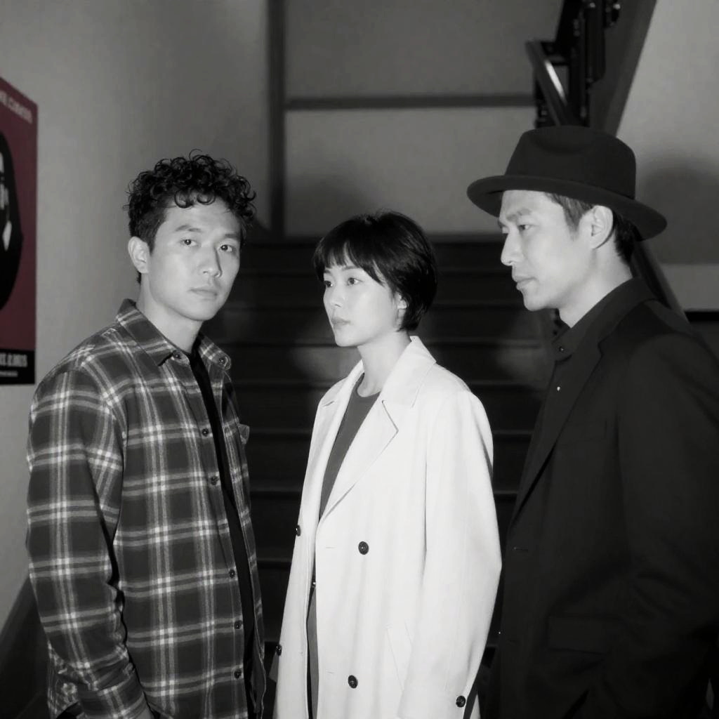 Black and white photograph of three people on a staircase. Man on left with short curly hair, plaid shirt, neutral expression. Woman in center with short hair, white coat, looking at man. Man on right with hat, dark clothing, looking downward. Staircase with shadowy figure in background. Poster on left with red and black .