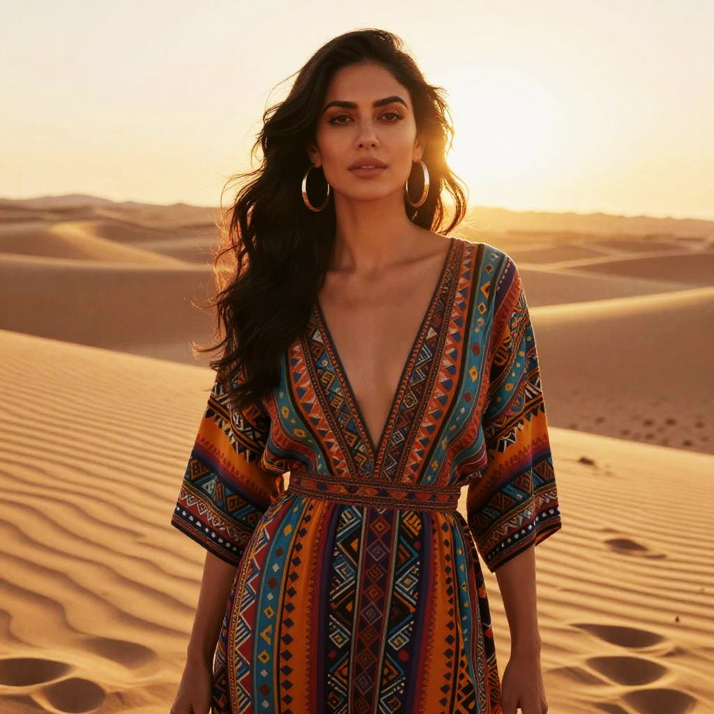 Photograph of a woman with long black hair, wearing a colorful, patterned kaftan over a black crop top, standing on a rooftop at