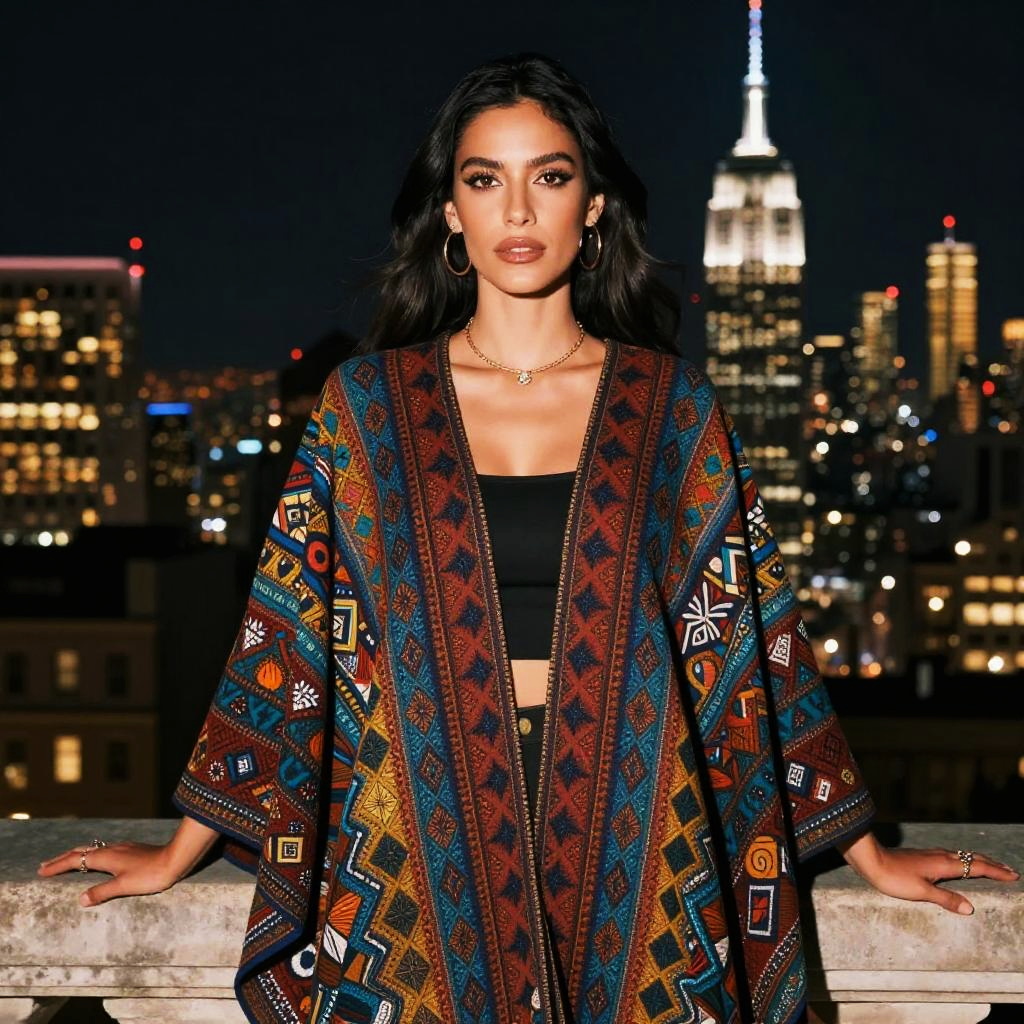 This striking image features a confident woman adorned in a richly patterned cloak, standing against a stunning city skyline illuminated at night. The vibrant colors and intricate designs of her attire reflect a unique artistic style, adding depth to her poised expression.