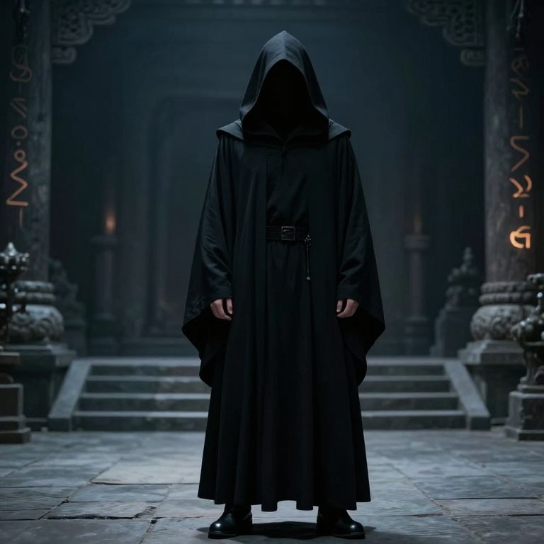 A tall, stoic male figure wearing a long black robe with a high hood that obscures his face, giving him a mysterious and enigmatic appearance. He stands confidently in a dimly lit, ancient courtyard, his black boots firmly planted on stone pavement. The atmosphere is atmospheric and slightly eerie, with soft shadows and faint glowing runes faintly visible in the background, suggesting a mystical or supernatural setting.
