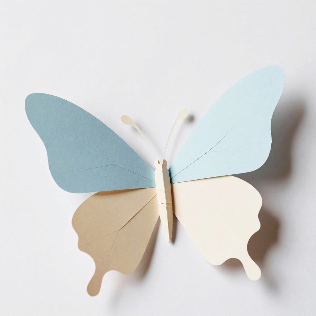 A beautifully crafted 3D paper butterfly with smooth curves and elegant shapes, placed on a clean white background with soft shadows, featuring a muted color palette of pastel blue, beige, and light brown, minimalist and delicate style, studio lighting