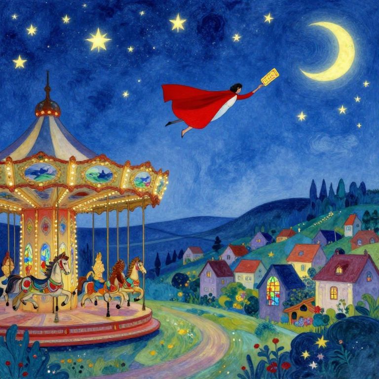 Imagine a dreamlike landscape reminiscent of Marc Chagall's whimsical style, where a carousel rotates beneath an azure sky adorned with luminous stars and glowing moons. A solitary figure in a flowing red cape gracefully soars through the air, defying gravity as they hold onto a golden ticket. The background features a quaint village nestled among rolling hills, its structures adorned with stained glass windows casting prismatic reflections on the ground below. This enchanting image captures a sense of wonder and escapism, evoking an emotional gradient that transcends reality into a realm of imagination and delight.