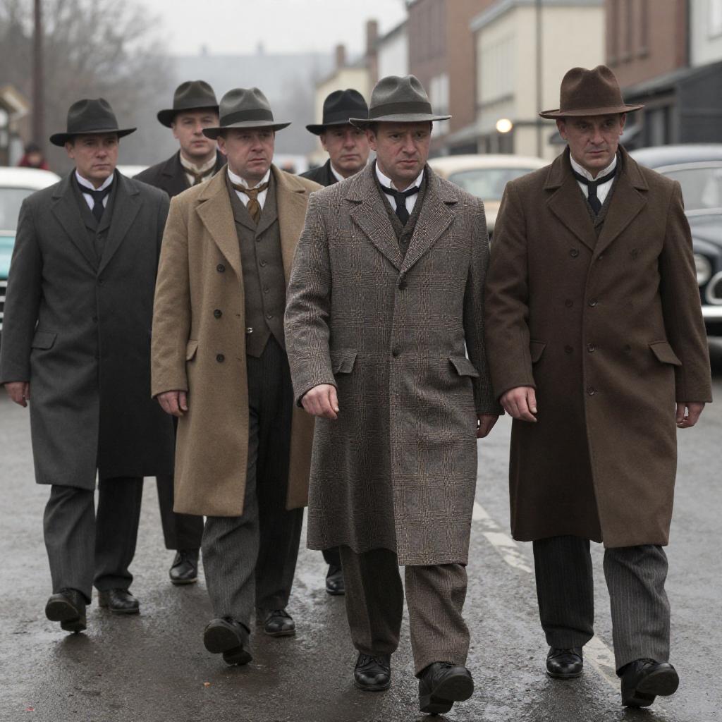 Photograph of 11 people in vintage clothing standing on stone steps. Central man in purple coat, top hat, cane, smiling. Red scarf, grey coat boy on left. Smiling women and men in hats and coats behind. Circular windows in yellow building. Red carpet. Various hats, scarves, and coats. Central man's intense expression. Group hugs, relaxed poses. Background: yellow ured wall, circular windows.