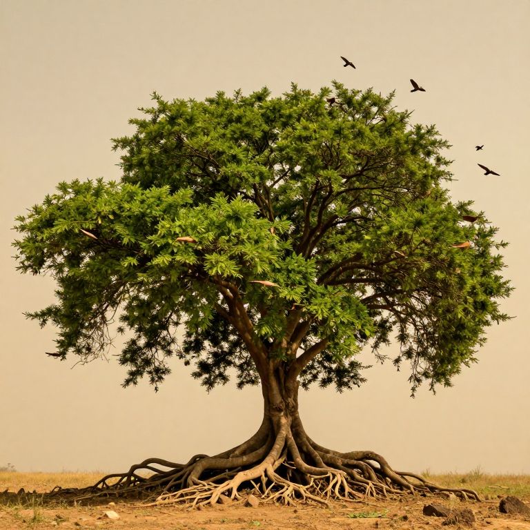 Vibrant green foliage crowns a gnarled, twisting tree with exposed roots sprawling across the ground, as a flock of brown birds flutters around and through its dense canopy against a warm, sepia-toned sky.