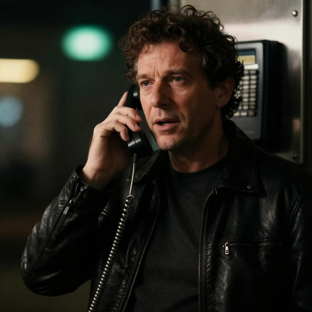 Middle-aged man with curly brown hair, wearing a black leather jacket, holding a black corded phone to his ear, speaking. Background has blurred green and yellow bokeh lights. Old-fashioned telephone on a metallic wall behind him. Dark, moody atmosphere.