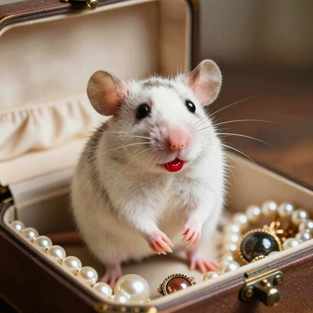 A charming rat wearing bold pink lipstick, holding a tiny compact mirror, in an elegant boudoir setting with soft pastel tones, luxurious fabrics and ornate details, whimsical scene blending realism with fantasy.