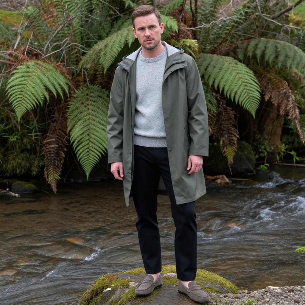 A man, olive green raincoat, slim-fit black trousers, light grey merino wool sweater, suede loafers, standing by a babbling brook, cinecolor, relaxed expression, surrounded by lush ferns. Man has masculine face and piercing eyes