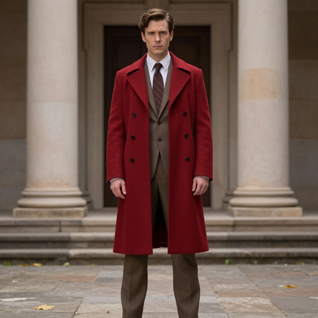 Photograph of a Caucasian man standing in front of a stone building with tall, white columns. He has short, dark brown hair and a serious expression. He wears a long, deep red, double-breasted overcoat over a brown, three-piece suit with a white shirt and dark brown tie. The overcoat's texture appears thick and woolen, contrasting with the smooth, formal fabric of the suit. The background shows a dark doorway framed by the columns, with a stone-paved ground in the foreground. The overall style is formal and elegant, with a slightly vintage or classic feel.
