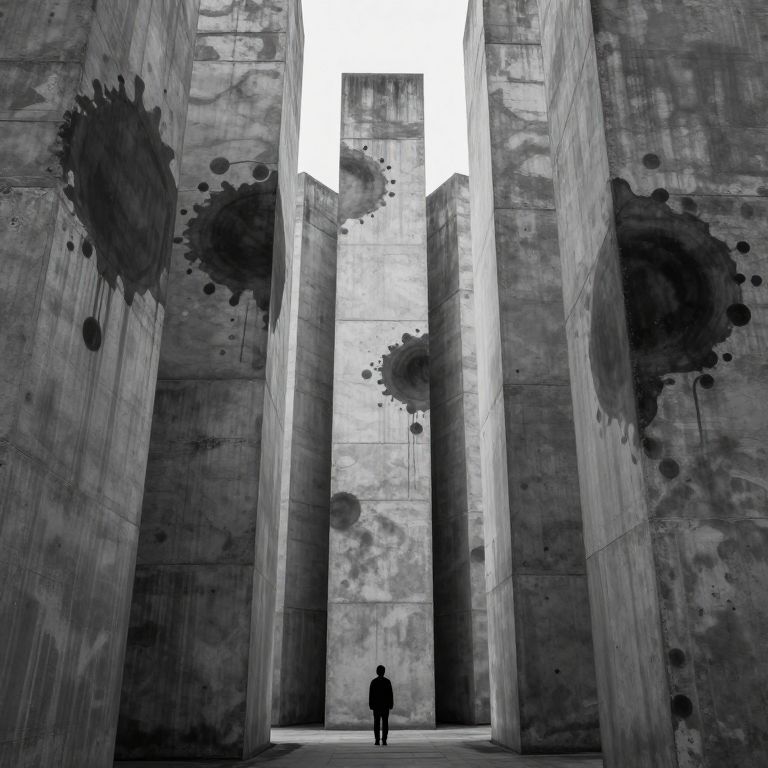 A hauntingly symmetrical arrangement of towering concrete structures, reminiscent of inkblot patterns, looms over a solitary figure standing at their base, evoking a surreal and introspective atmosphere akin to the subconscious reflections of the last visitor.
