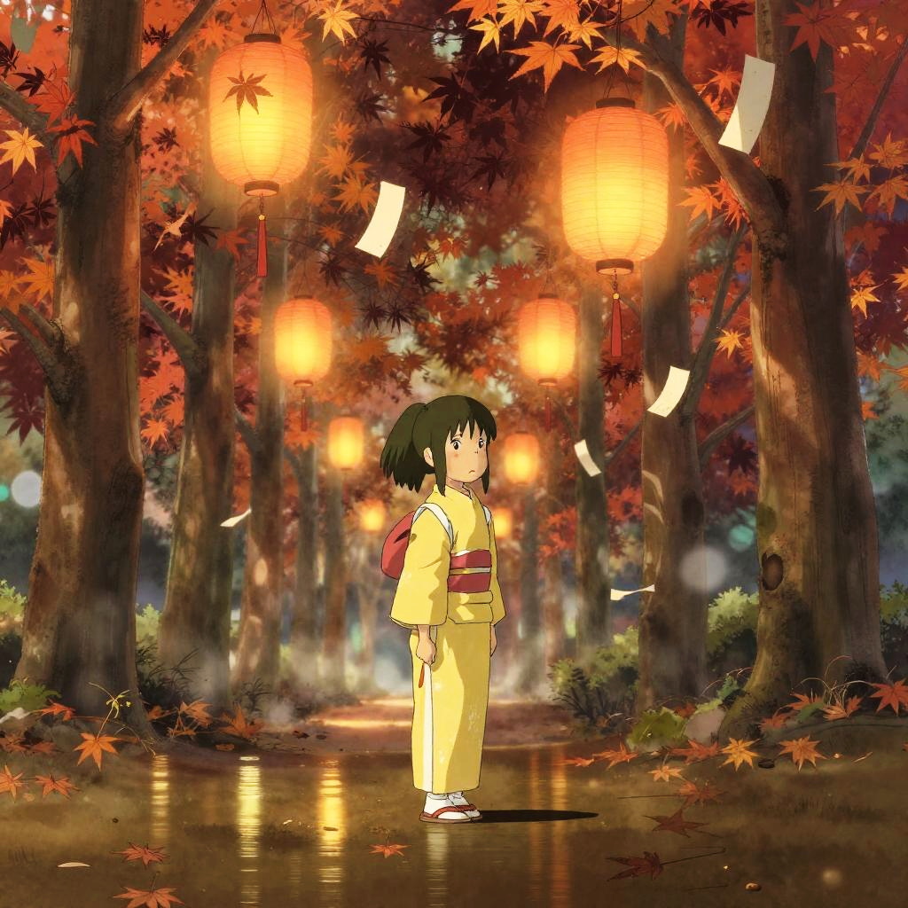 Spirited Away-inspired fantasy at a sun-dappled maple tree grove in autumn; a young girl in a yellow furisode kimono stands amid glowing lanterns and fluttering paper talismans. soft pastel and ink wash aesthetic with delicate linework, soft edges, and subtle washi texture. Cinematic composition with leading lines and a clear vanishing point, warm golden and rich burgundy grading, volumetric light, gentle fog, soft bokeh, polished wood reflections, high detail, subtle film grain, calm, wistful mood.
