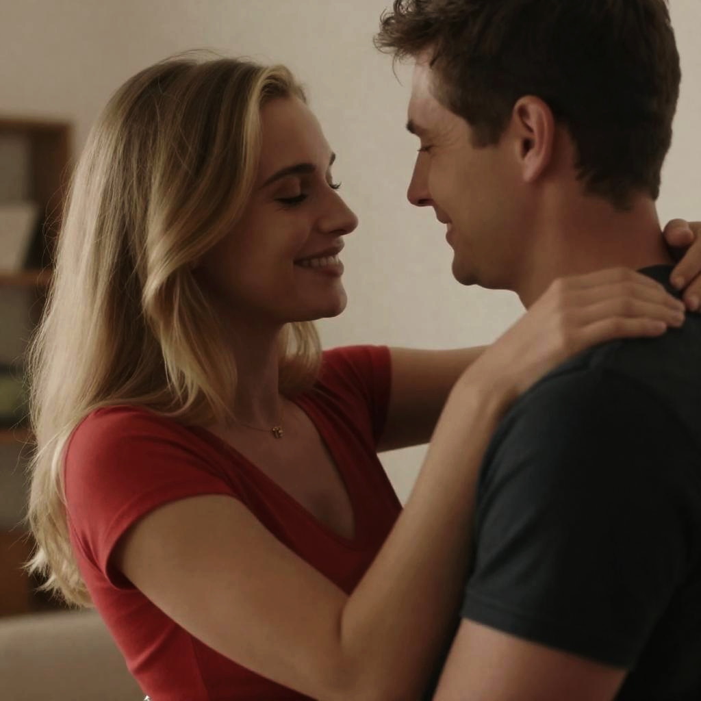 Photograph of a couple in a close embrace. Blonde woman in red top, smiling, with closed eyes. Man with short brown hair, black shirt, looking at her. Warm indoor lighting, blurred background. Woman's right arm around man's neck. Intimate, soft expression.