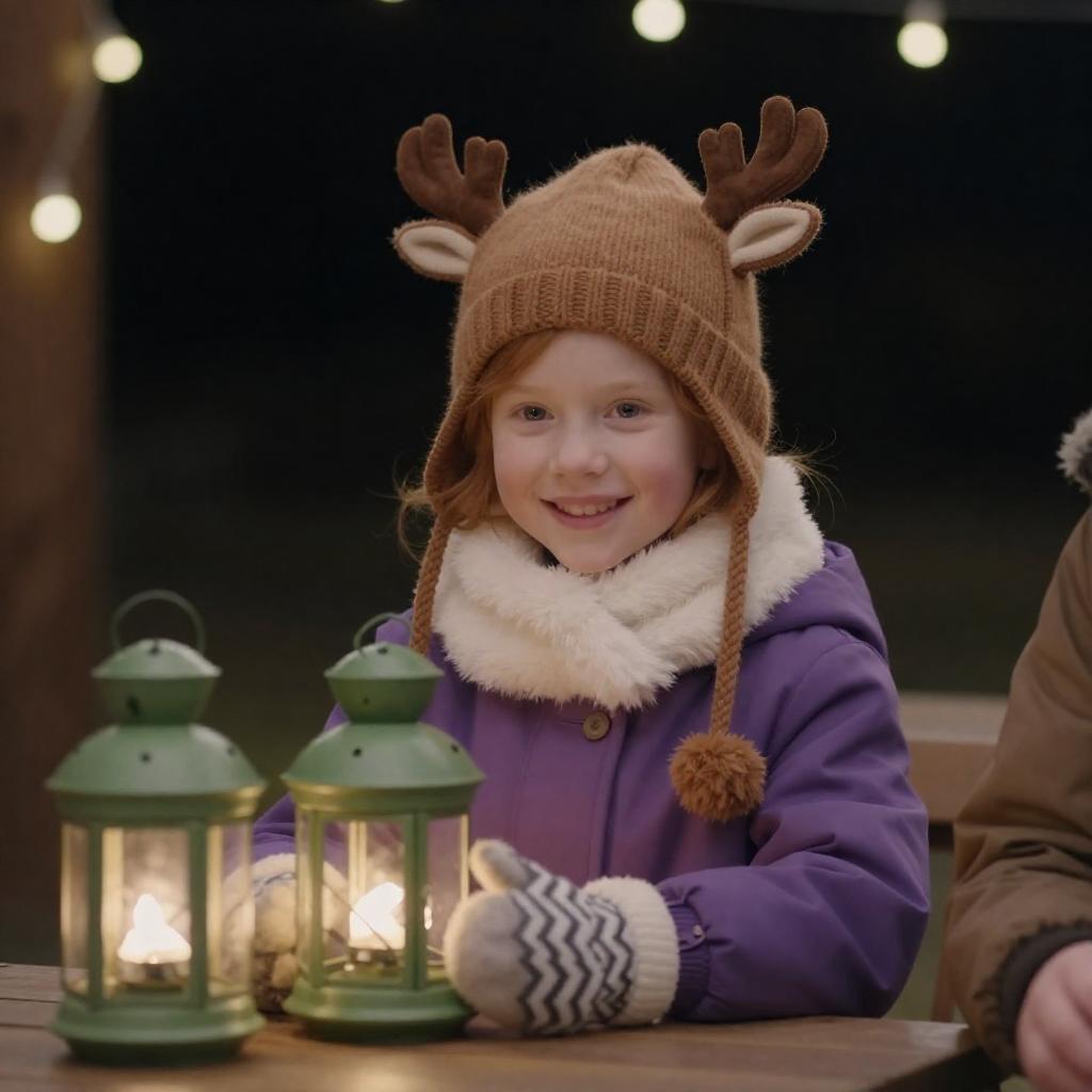 Photograph of a young girl with red hair, wearing a brown knitted hat with reindeer antlers, purple coat, and white fur scarf, smiling. She has mittens with a chevron pattern. She is sitting at a wooden table with two green lanterns emitting soft light. Background is dark with blurred lights. Another person's arm in a brown jacket is partially visible on the right.