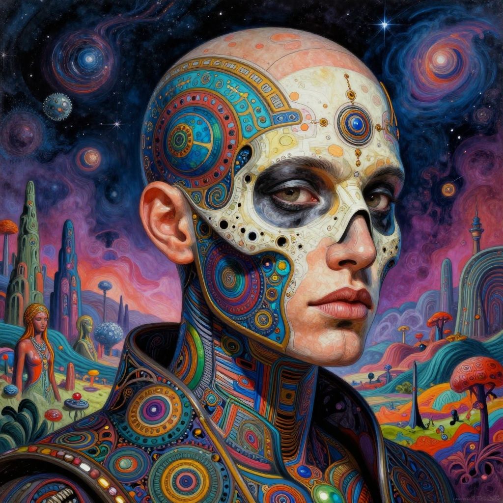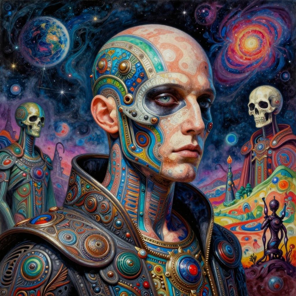 ((masterpiece, high quality, best quality, 8k, wallpaper, fine lineart, highly detailed, absurdres)), cinematic photo magical style land art style hyperrealistic, ( vaporwave:1.3), vivid colors, intricate details, realistic style, oil paintings, acrylic paintings, watercolor paintings, digital illustrations, mixed media pieces, sculptures casting shadows, ( cosmic sky:1.2), photorealistic, extreme detail, lifelike, crisp, precise. natural materials, outdoor, detailed blend of organic and magical elements, futuristic, legendary, detailed, intricate, film, bokeh, professional, 4k, in the style of art, colorful, phone wallpaper, (in a magic room:1.5), Focus on the protagonist waking up at dawn, feeling the weight of their impending mission while surrounded by relics of pre-cataclysmic Earth. Explore their morning routine, including any subtle acts of rebellion against The System, before joining their comrades for a secret rendezvous