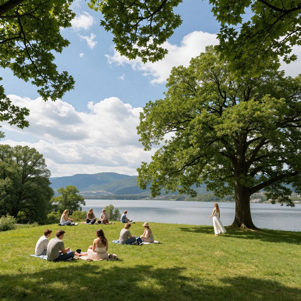 Photograph of a sunny park scene with a lake in the background. Green grass and tall trees frame the image, with a bright blue sky and fluffy white clouds overhead. In the midground, a woman in a white wedding dress stands near a tree, gesturing with her right arm. In the left background, four people sit on a blanket, engaged in conversation. The lake reflects the sky, and distant hills add depth to the landscape. The overall atmosphere is serene and picturesque, capturing a moment of calm and beauty.