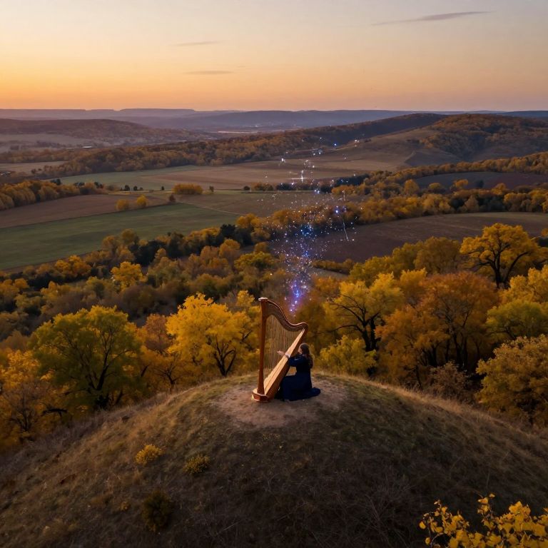 In the spirit of post-impressionism with digital finesse, envision an autumnal panorama from an aerial viewpoint, where a solitary figure rests on a hilltop, their hands coaxing melodies from a mystical harp that seems to draw constellations into existence. This scene balances twilight's wistful allure and dawn's promise, transitioning through a rich spectrum of golds as the landscape shifts from nostalgia to rebirth. The artwork captures the fervor and dynamism reminiscent of Monet's masterpieces while weaving in threads of fantasy and enigma, inviting the viewer to immerse themselves in its ethereal beauty.