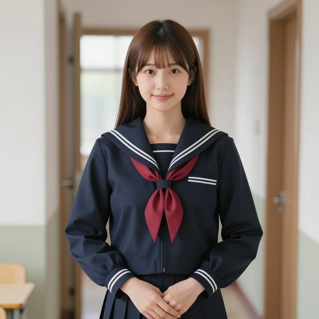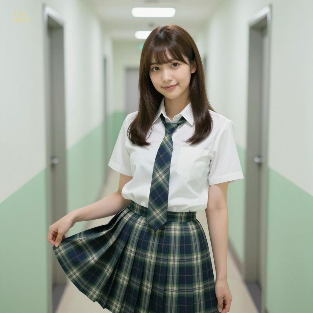 Asian woman with straight brown hair and bangs, wearing a white short-sleeve shirt, green and blue plaid tie, and matching plaid skirt. She holds the skirt out to the side with her right hand. Standing in a bright, green-walled hallway. Smiling. Soft lighting. Cks Japan in top left corner.