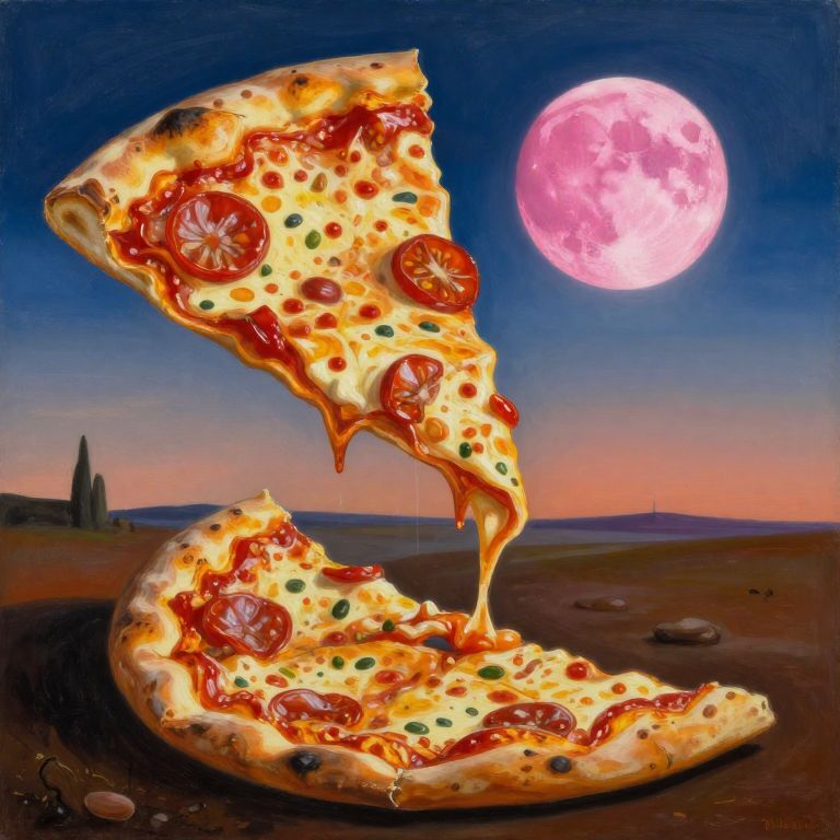 Raw surrealist Dalí-esque painting by Michael Trevithick including disjointed imagery of a pizza slice, a pink moon, a sky at dusk,