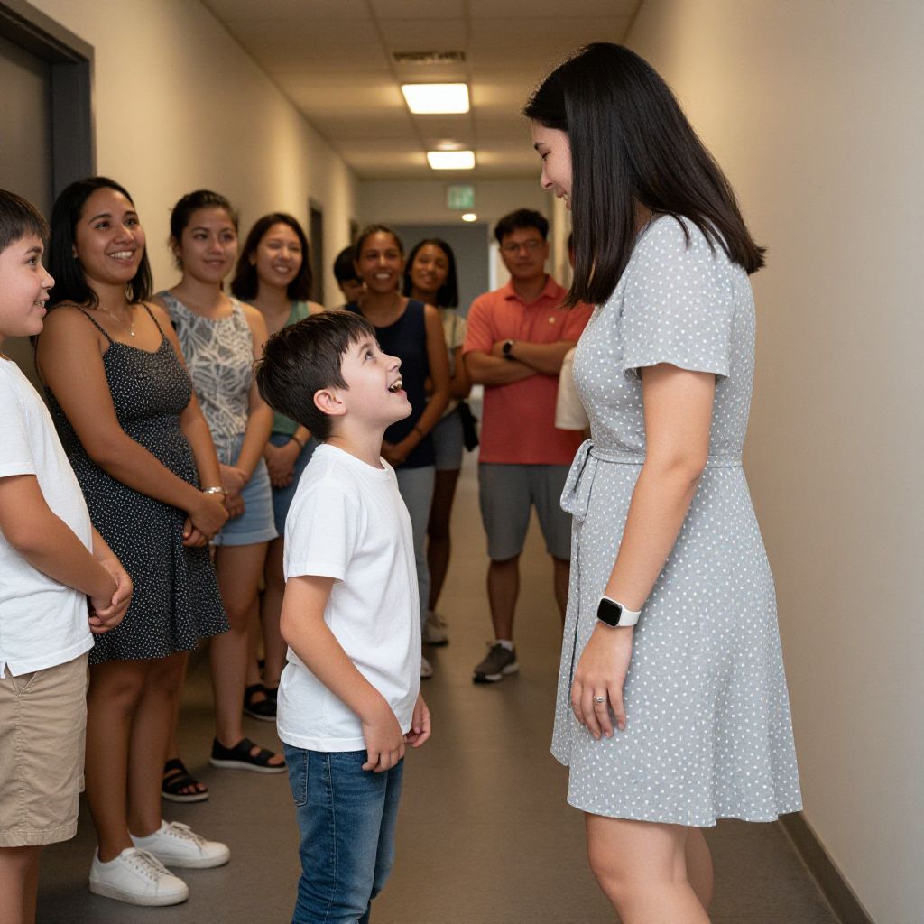 Joyful laughter fills the hallway as a young boy in a white T-shirt and jeans shares a moment with a woman in a gray polka-dot dress, surrounded by a crowd of smiling onlookers.