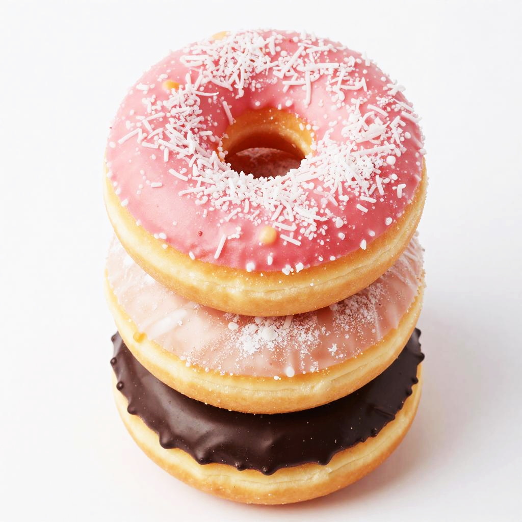 A close-up, top-down photo of a stack of three colorful donuts. The top donut is pink with shredded coconut, the middle one is white with powdered sugar, and the bottom donut is dark chocolate. The background is plain white, making the donuts stand out. The image has a high contrast and bright colors, giving it a vivid, appetizing look.