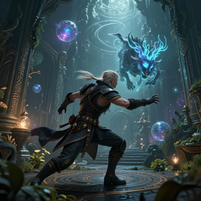 Arcane hunter tracking a spectral beast through an ancient enchanted ruin, illuminated by floating magical orbs, dynamic action pose, detailed environment with mystic plants and arcane inscriptions, fantasy realism, atmospheric and immersive.
