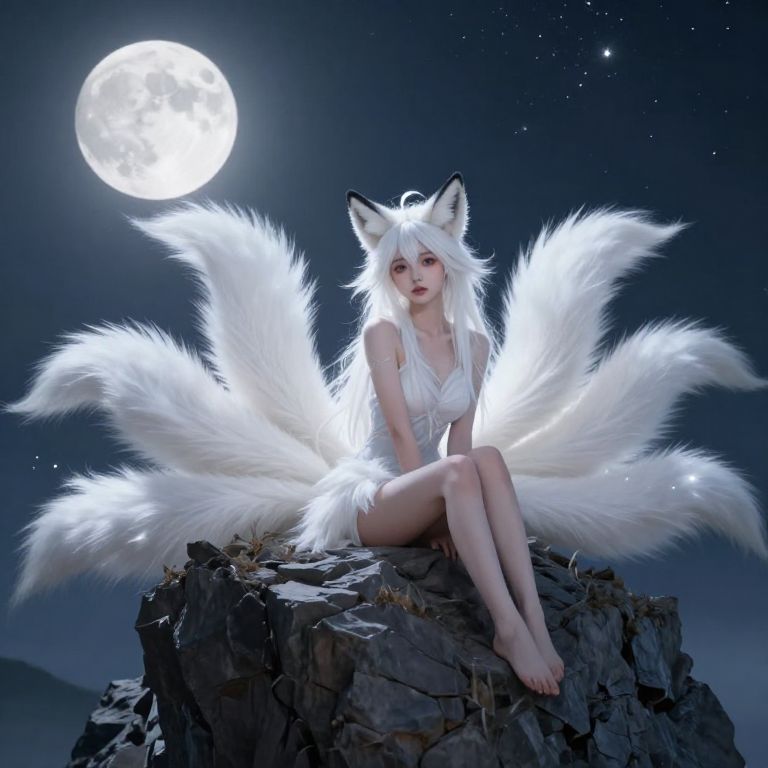 White haired fox girl with multiple fluffy tails, sitting atop a rocky cliff under a full moon, starry sky, fantasy realism, soft glowing aura surrounding her