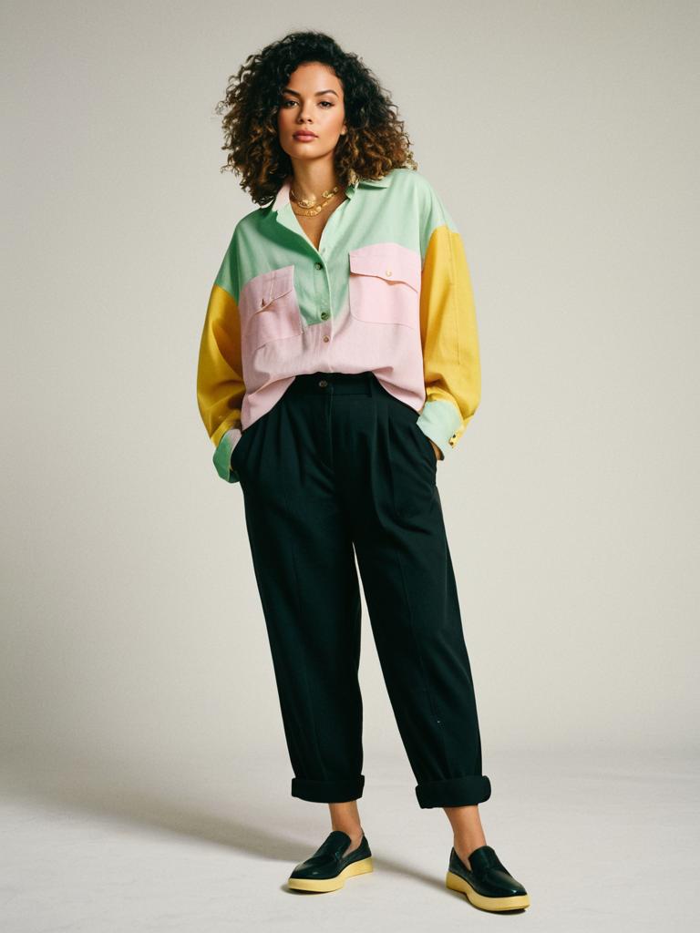 Woman, color block, oversized button-up shirt with pastel shades of pink, green, and yellow, drop shoulder, long cuffed sleeves, black relaxed-fit trousers, no visible shoes, minimal jewelry with a delicate necklace, curly mid-length hair, neutral studio background