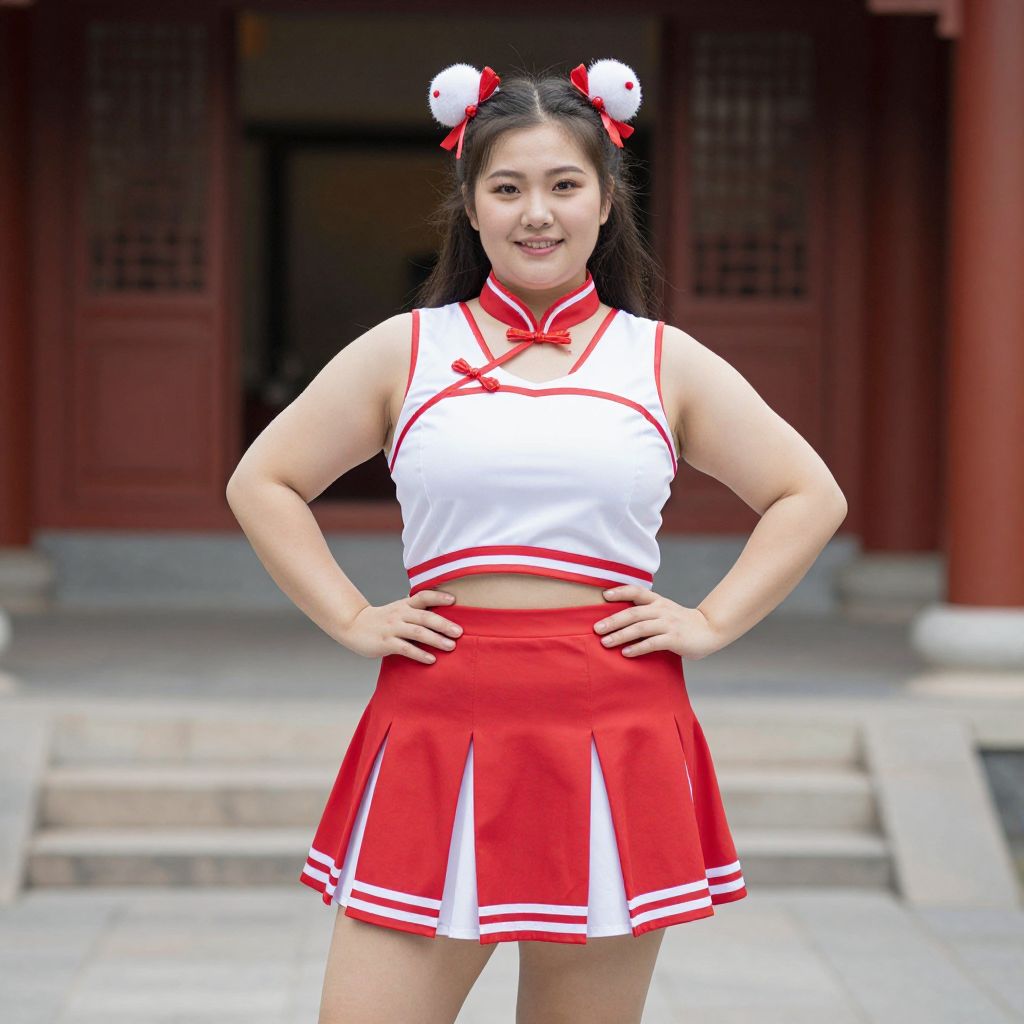 Asian woman in white and red cheerleader outfit with red skirt, white and red hair buns, standing confidently in front of traditional red building. Photograph