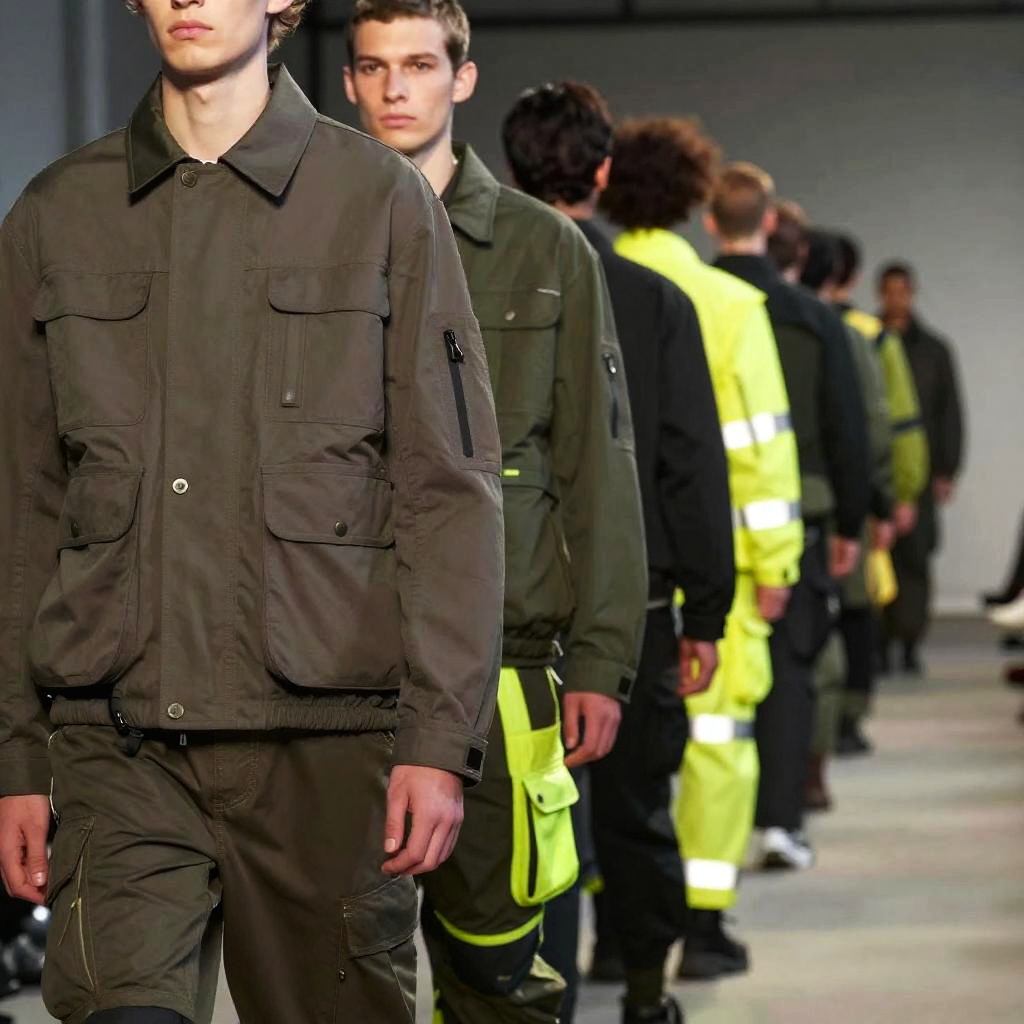 Workwear clothing line on a fashion runway blending utility with style, models wearing functional jackets and cargo pants, muted earth tones with bright safety accents, spotlight in a minimalist industrial space, high-detail close-ups capturing fabric textures.