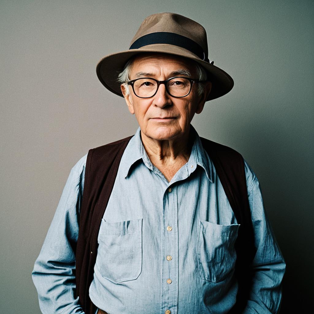 Portrait of an elderly white man wearing a brown fedora hat, black-rimmed glasses, light blue collared shirt with pockets, and a dark brown vest. He has wrinkled skin and stands with hands in pockets, looking directly at the camera with a neutral expression. The background is a plain gray.