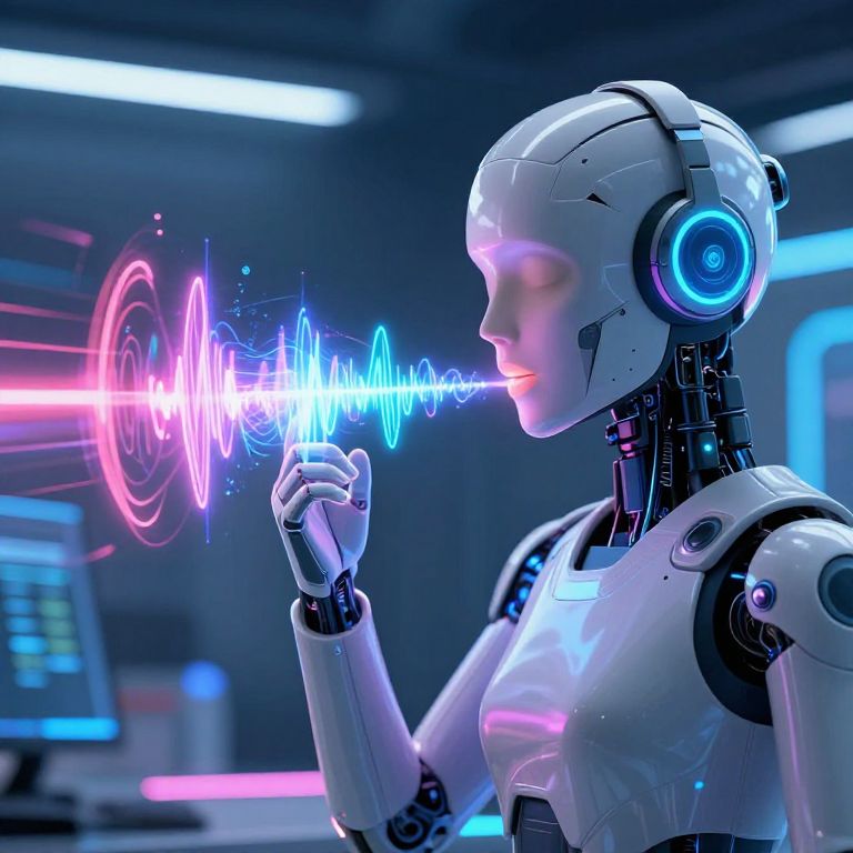 Pronounce concept illustrated by a futuristic AI assistant speaking clearly with glowing sound waves emanating from its mouth, vibrant colors, digital art style, high-tech sleek environment, focus on clarity and communication.