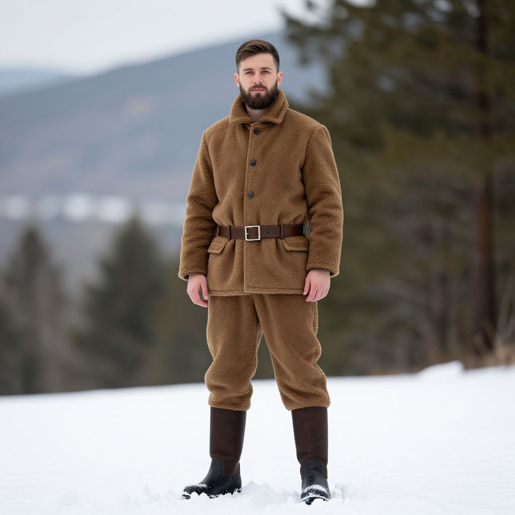 Brown dwarf costume, 1boy, male focus, beard, solo, facial hair, outdoors, hat, blurry, belt, blurry background, standing, boots, brown hair, full body, long sleeves, tree, pants, jacket