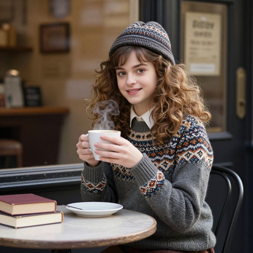 In this detailed and vibrant scene, a young woman with long, wavy brown hair, reminiscent of Hermione Granger, sits at a small round table outside a cozy coffee shop. She is dressed warmly in a patterned knitted sweater and a matching knitted hat, holding a steaming cup of coffee in her hand. The coffee shop, with its inviting atmosphere, features books on the table, suggesting a quiet, intellectual setting. The woman's smile radiates warmth and contentment, adding to the serene ambiance of the scene.