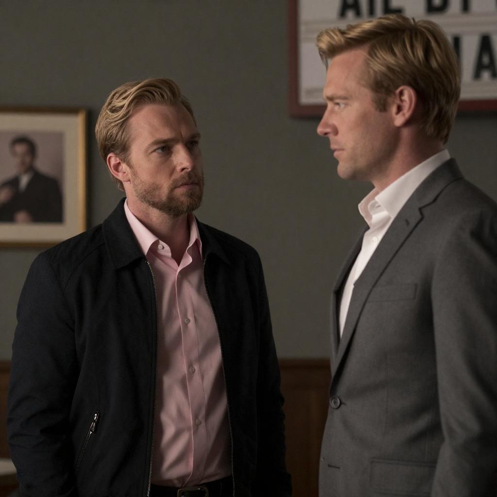 Two men in a nighttime scene, running together. The man on the left, with blond hair, wears a black leather jacket, gripping the other man's shoulder. The man on the right, with dark hair and beard, wears a blue denim jacket, looking determined. Background includes blurred street lights and a tree. Both men have intense expressions.