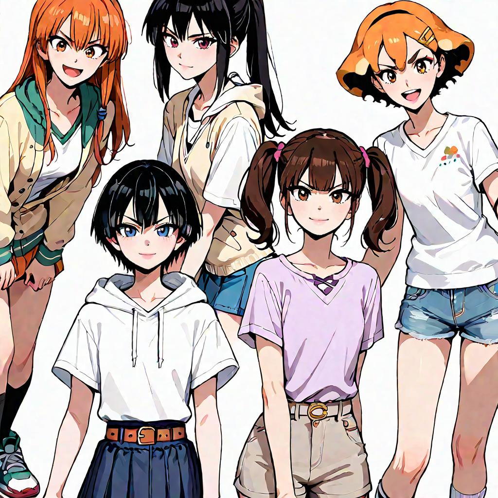 Score_9, score_8_up, score_7_up, best quality, 4k, prefect lighting, rating_explicit, newest, official art, looking at viewer, upper body, smile, flat chest, ADDCOMM4girls, ryzkkaoru_AA, ryuzaki kaoru, short hair, yellow eyes, orange hair, thick eyebrows green hooded jacket, denim shorts, socks, hood down ADDCOL4girls, sskchie_AA, sasaki chie, black hair, hairclip, bangs, brown eyes, yellow cardigan, open cardigan, open clothes, white shirt, blue skirt ADDCOL4girls, ykharu_AA, yuuki haru, long hair, purple eyes, white hoodie, gray shorts, sneakers, short sleeves, hood down, ADDCOL4girls, mtbrisa_AA, matoba risa, twintails, v-shaped eyebrows, yellow ribbon, pink camisole, white skirt, animal print, belt, navel