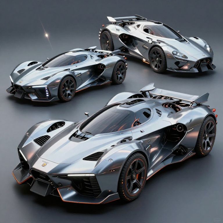 Photorealistic CGI of three sleek, silver, aerodynamic supercars with glossy finishes, black rims, and aggressive designs, set against a dark gradient