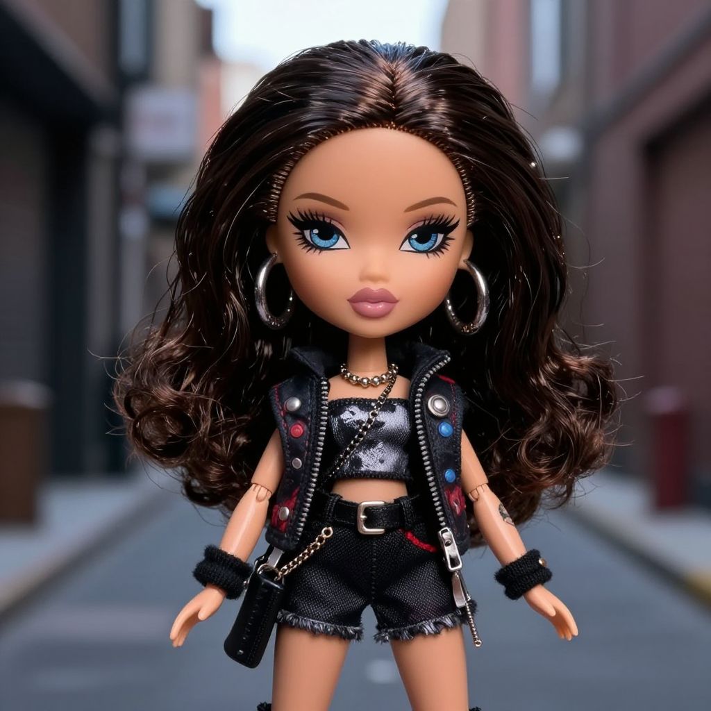 Bratz doll generator crafting an edgy, confident doll with voluminous hair and expressive eyes, dressed in grunge-inspired fashion with layered accessories, placed in an urban alley scene with moody lighting, high resolution artwork.