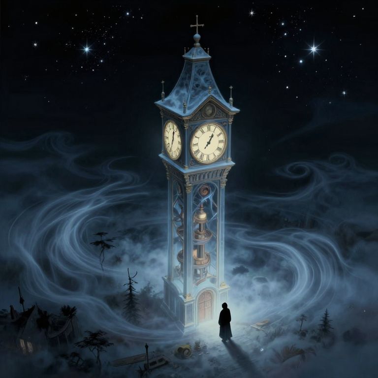 Mysterious, glowing clock tower under a starry night sky, surrounded by swirling blue mist. Silhouette of a figure stands before it. Digital art