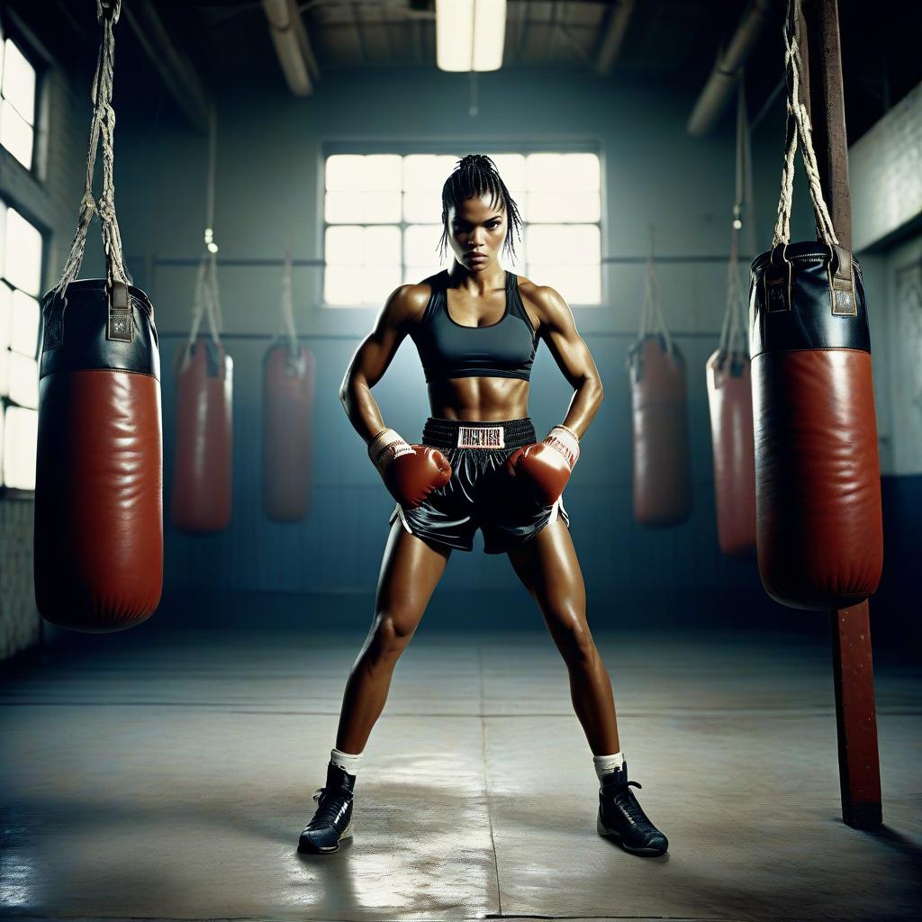 Full-body shot of a fierce female boxer, posed in a gritty gym, shot by Steven Meisel and Mario Testino, intricate texture, perfect details, film grain, analog photograph, shot on Phase One camera.