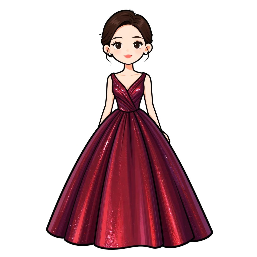 Woman with pretty face and pretty hair. Woman, evening elegance, deep red metallic ball gown, V-neckline, sleeveless, concealed pockets, full-length voluminous skirt, minimal jewelry with stud earrings, swept-back updo, plain white studio background. --sref 1461