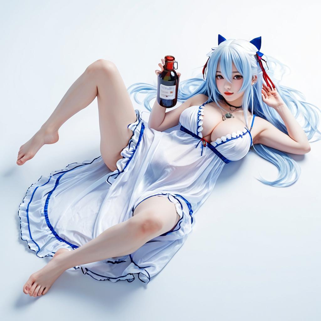 Digital anime-style artwork of a blue-haired woman with cat ears, lying on her back, wearing a white, frilled dress, holding a bottle,