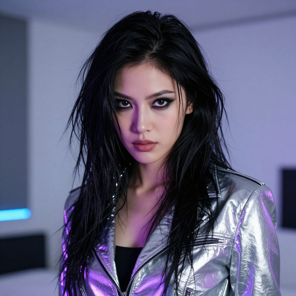 Photorealistic image of a fierce-looking woman with long, messy black hair and intense dark eyes. She's wearing a shiny, metallic silver jacket that reflects purple and blue lights in the background. The background is a minimalistic, modern room with white and gray walls and subtle blue lighting. Her makeup is dramatic with dark eyeshadow and bold eyeliner.