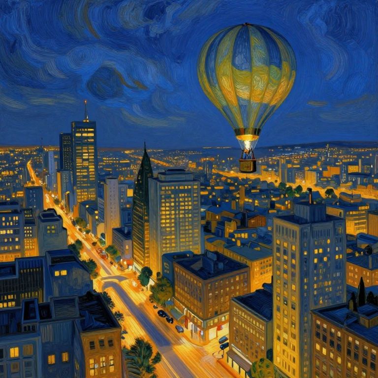 Imagine an expansive bird's-eye view of a vibrant city at dusk, with towering skyscrapers glowing in warm, golden hues against the deepening blue sky. As the sun sets, it casts elongated shadows across streets and buildings, weaving a complex pattern of light and shadow. A solitary hot air balloon drifts silently through this urban landscape, carrying an observer who gazes down at the cityscape below with a sense of tranquility and contemplation. The gentle flame of the balloon's basket softly illuminates the passenger's face, evoking a serene atmosphere. This captivating scene is painted in the dynamic, expressive style reminiscent of Vincent van Gogh, showcasing his signature use of vivid colors and bold brushstrokes to capture both the beauty and solitude nestled within this bustling metropolis.