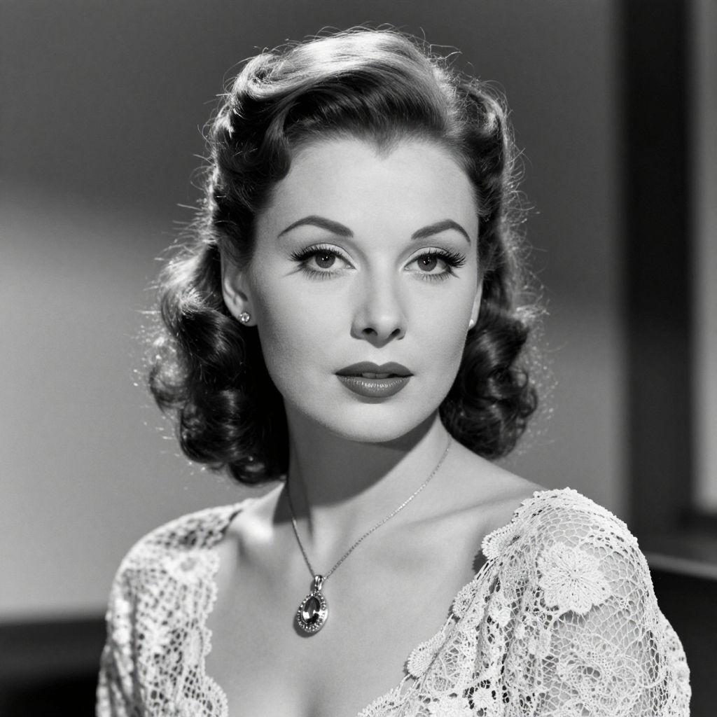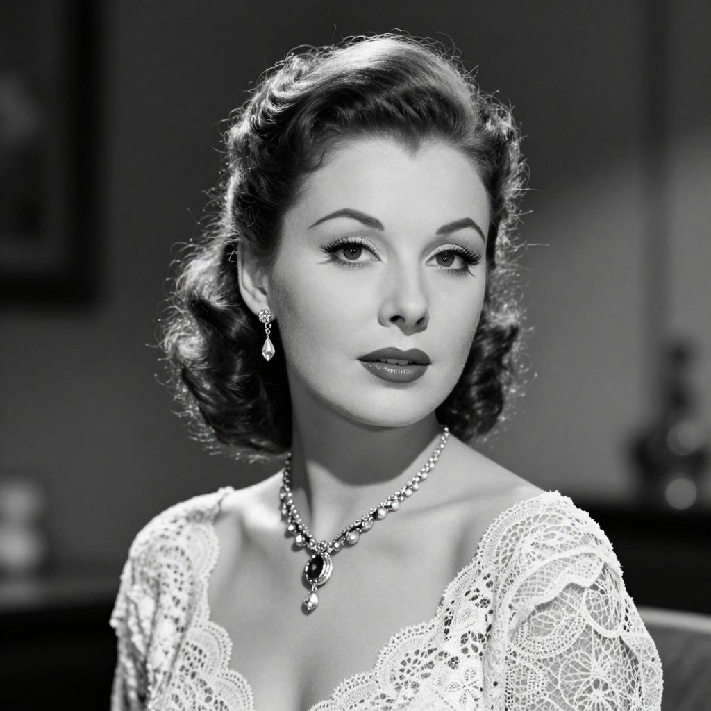 A high-definition, vintage-style black-and-white portrait of a woman with classic Hollywood glamour, featuring intricate lace detailing on her attire, dramatic lighting that accentuates her elegant hairstyle and jewelry, and a timeless aesthetic reminiscent of mid-20th-century photography.